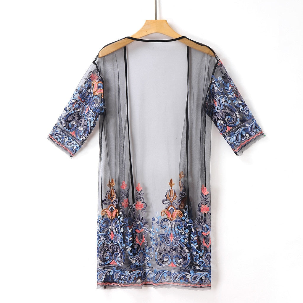 Summer Fashion Floral Embroidery Mesh Kimono Blouse Top Cardigan Blouses Beach